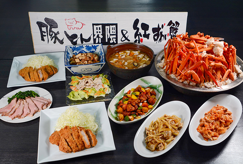ボイル紅ズワイガニと豚肉料理(とんかつ・ヒレカツ・豚しゃぶサラダ・酢豚・豚角煮・和風ローストポーク・とん汁・豚キムチ・生姜焼きの中から4種以上)提供します。