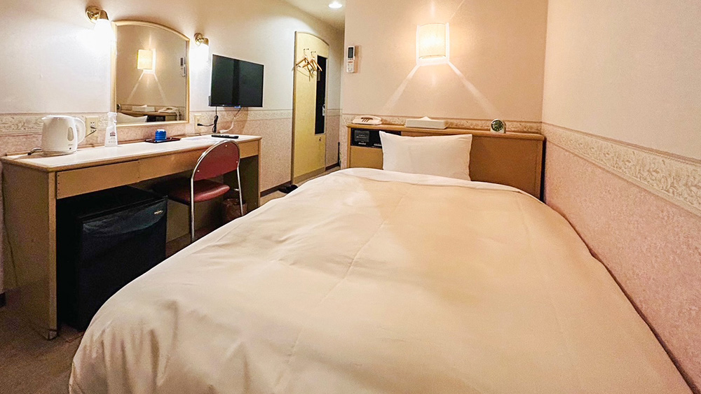 16平米と通常ビジネスホテル(11~12平米)より広く、ゆったりとお寛ぎいただけます。2名利用時には1台のベッド(120cm幅)での添い寝となります。