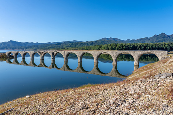 旧国鉄士幌線の遺構・タウシュベツ川橋梁で有名な湖。湖畔の自然と鉄道遺産の風景は「北海道遺産」にも指定され、歴史と自然の魅力を同時に味わえます。