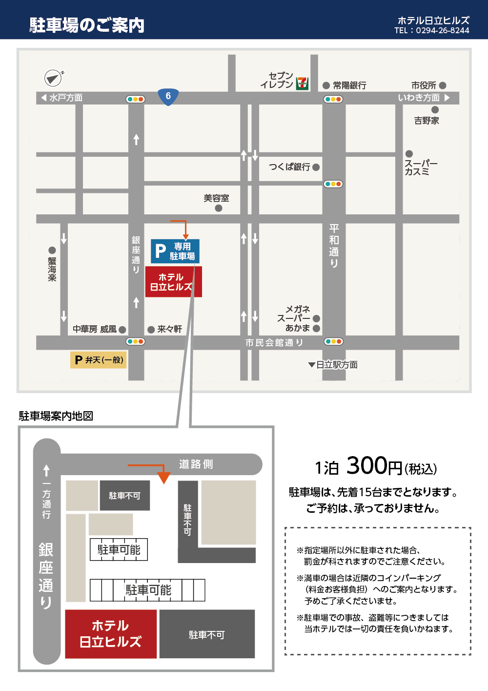 ホテル駐車場 15台 料金¥300/泊(税込)※先着順・予約不可