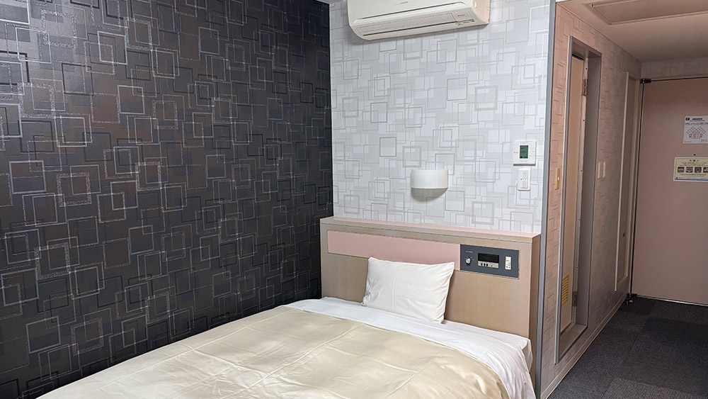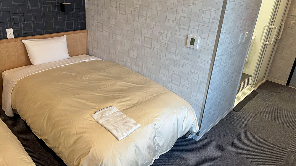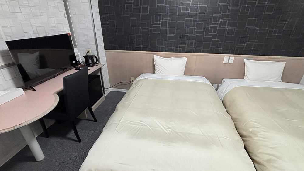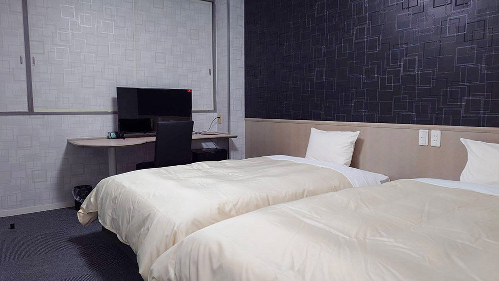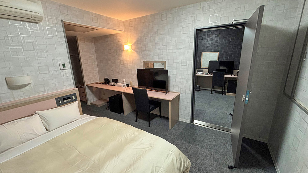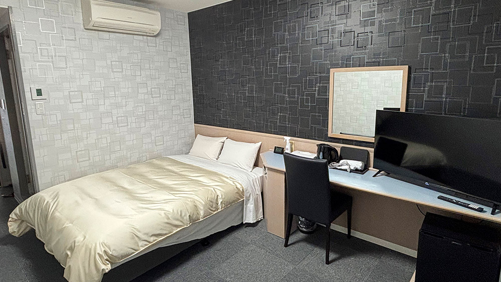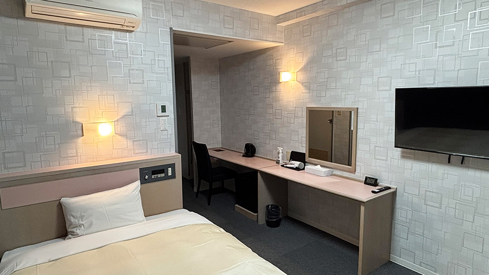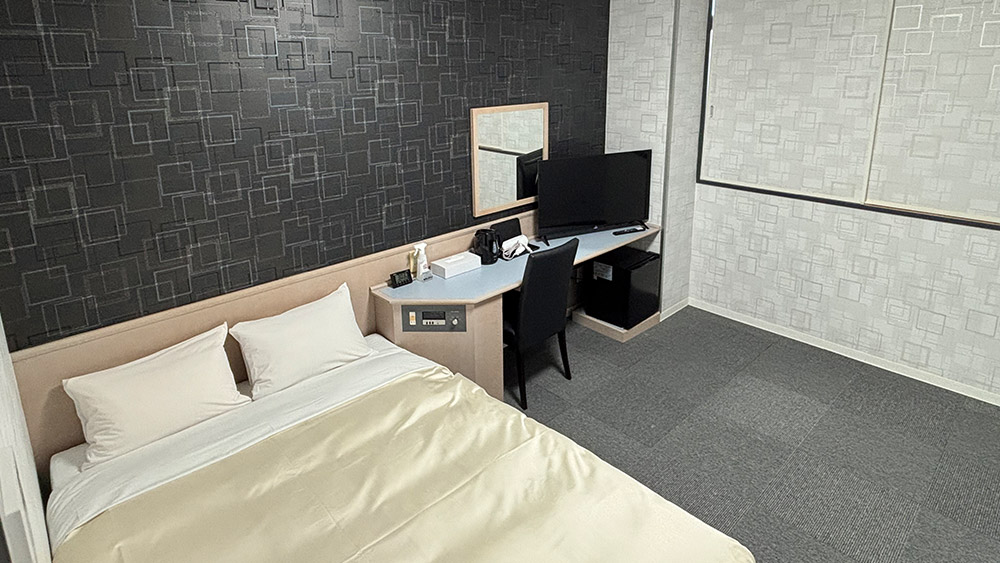 18m²以上の広々とした落ち着いた空間に140cm幅のダブルベッドを備え、充実した設備で快適にお過ごしいただけます。