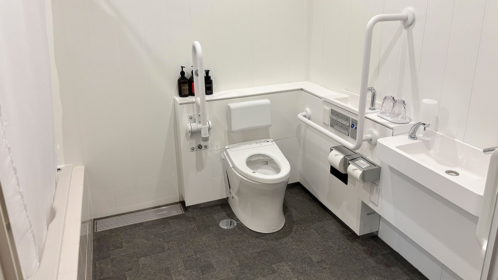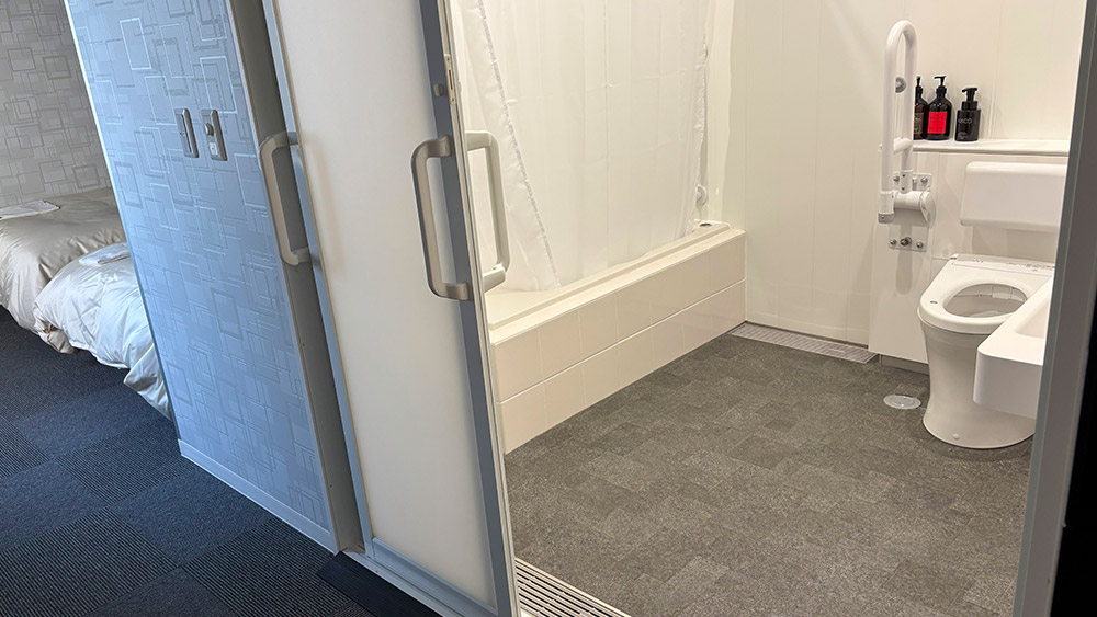 20m²のゆとりあるバリアフリールーム。120cm幅のベッドを2台備え、車椅子でのご利用にも配慮した安心設計です。快適にお過ごしいただける広さと設備をそなえています。