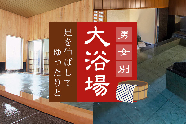 - ご宿泊のお客様専用にて、無料でご利用いただける男女別の大浴場を完備しております。足を伸ばしゆっくり浸かっていただければ一日の疲れが癒されます。