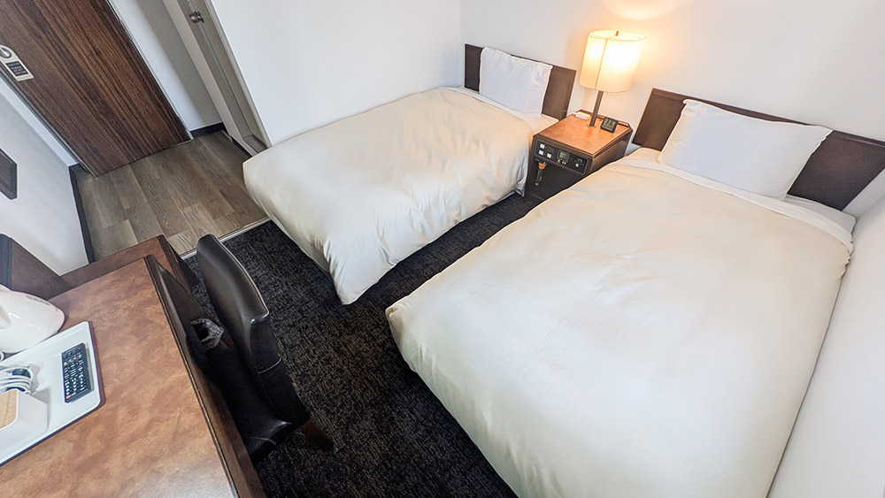 100cm幅のベッドを2台ご用意した、スタンダードなツインルームです。お部屋の広さは約15平米、ユニットバス付きで、最大2名様までご利用いただけます。