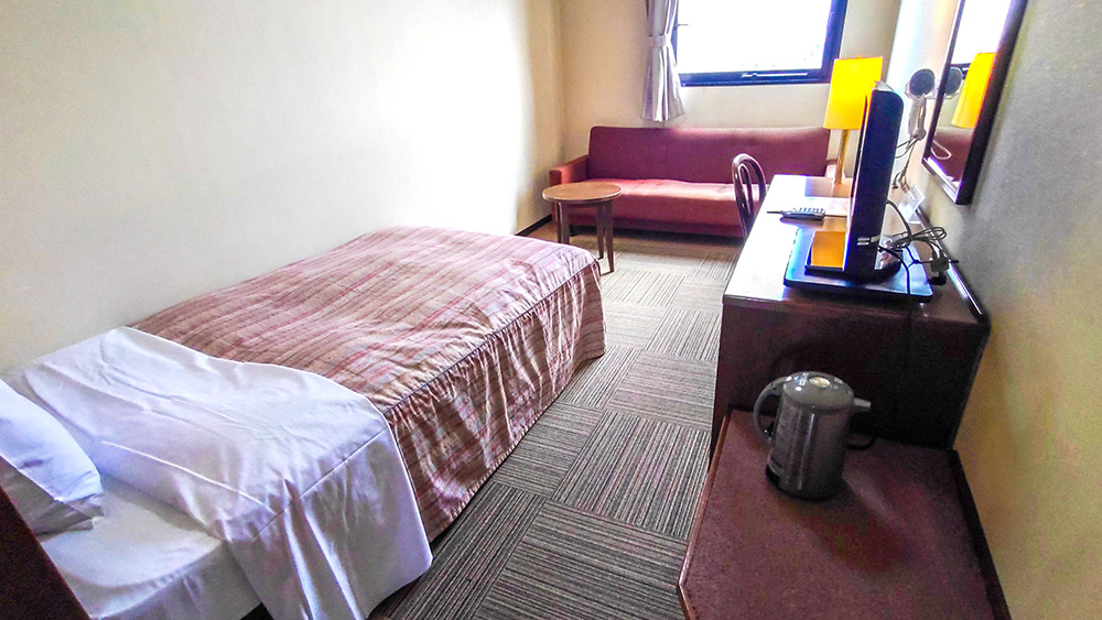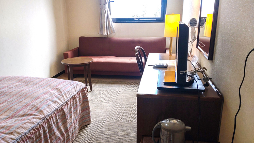 ビジネスや一人旅にぴったりの洋室シングルルームです。バス・トイレ付きで快適な滞在をサポートします。無料Wi-Fiやテレビ、冷蔵庫などの基本設備も充実しており、ひとり旅でも安心してご利用いただけます。