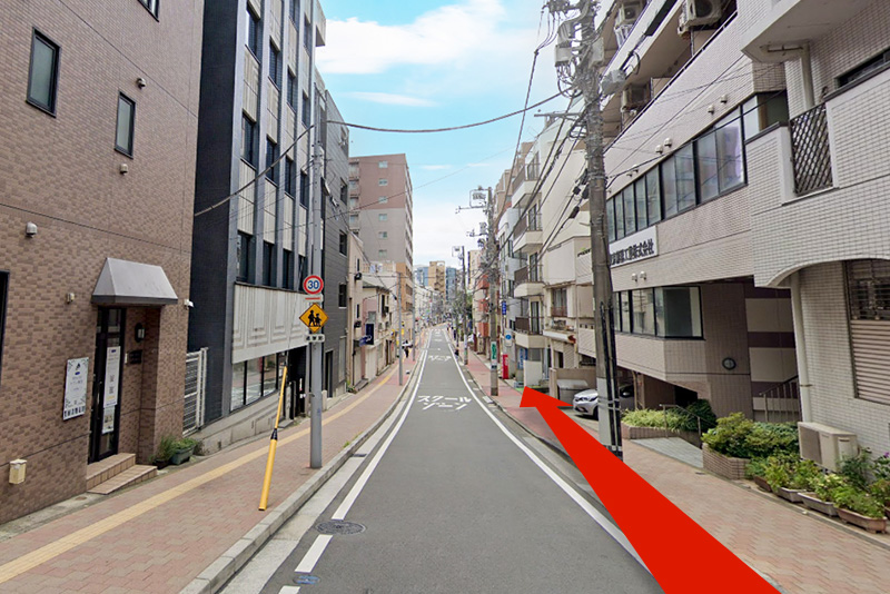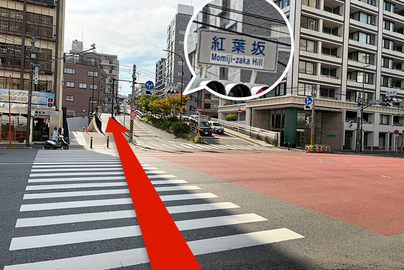 ④ 「紅葉坂」交差点を左に曲がり坂を登ります。