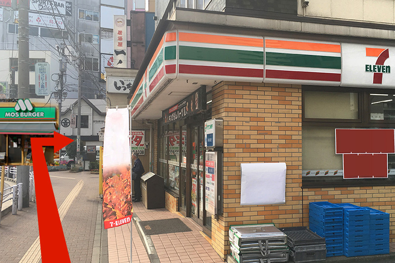 ④「「セブンイレブン」を左前方に進み、信号を渡って「モスバーガー」を右に曲がります。