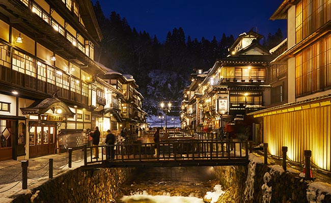 - 郷愁を感じるノスタルジックな町並みの温泉街。尾花沢市にある大正浪漫を感じるような趣ある温泉街で、タイムスリップしたような雰囲気が魅力です。日が暮れると温泉街にガス灯が灯ってさらにロマンチックになります。