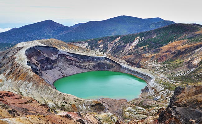 御釜 - 蔵王刈田岳・熊野岳・五色岳の3峰に抱かれた円型の火口湖。釜状なので「御釜」という名前がつきました。湖面はエメラルドグリーンの水をたたえ、荒々しい火口壁と対比して神秘的な雰囲気です。山形駅からも直行バスが運行しています。