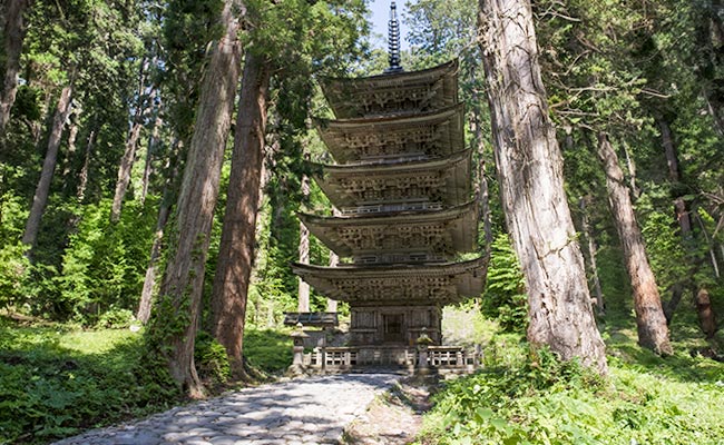 - 羽黒山参道、「一の坂」上り口の杉並木の中にあり、東北地方では最古の塔といわれ、平将門の創建と伝えられています。高さ29メートルの三間五層柿葺素木造で、昭和41年には国宝に指定されました。