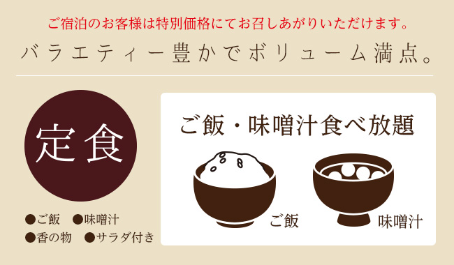 明るく、カジュアルな雰囲気のレストランでは、地元食材を使った約50種類の朝食バイキング。夕食は新鮮素材を活かした定食等をお楽しみいただけます。団体様向けのプランもご用意しております。お気軽にお問い合わせください。