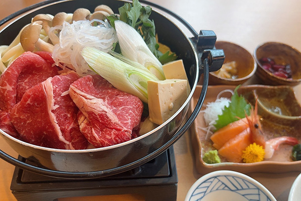 内容 すき焼き/お造り(甘海老・サーモン)/小鉢/サラダ/ご飯/味噌汁/漬物/デザート