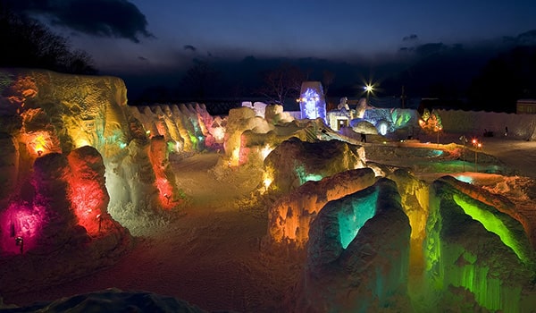 - 毎年1月下旬~2月中旬にかけて開催される氷濤まつりは、支笏湖の冬の風物詩。支笏湖の湖水をスプリンクラーでふきかけて創られる氷の巨大オブジェは昼と夜でまったく違った表情を見せる。週末には花火大会も開催。