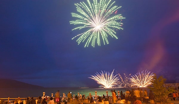 - 湖ならではの水上花火と、夜空の打ち上げられた花火が大輪の花を咲かせる。ステージイベントやゲームなども行われ、支笏湖の短い夏を楽しむことができる。