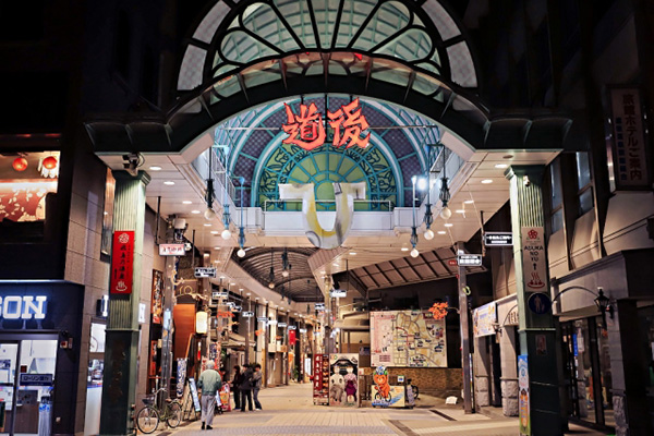 道後温泉本館から道後温泉駅までL字型のアーケードでつながっており、250mほどの商店街には土産物店やカフェ、レストランなど60店舗あまりが軒を並べています。